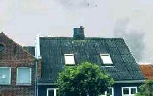 Tidligere har Århus meldt ud at mågerne kunne blive en plage for byen, men nu har de også fundet vej med redebyggeri og udrugning af unger midt inde byen. Således har en ikke brugt skorsten i Mogensgade været redested, og som det ses på billedet har to grå mågeunger endnu ikke fundet sit rette element ved Grenaa Strand. De voksne måger flyver rundt omkring reden med høje skrig for at fortælle alle og enhver, at de skal holde sig væk fra deres unger.