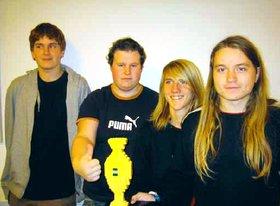 Billedet viser GTS’ deltagere, samt deres flotte LEGO-pokal. Fra venstre har man Christian Møllgaard (1. IT), Troels Hansen (1. IT), Andreas Poulsen (1. IT) og deres træner, Bjarke Andersen (2. IT).