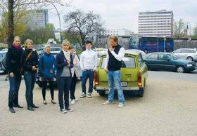 Andreas, Anne, Ida, Josephine, Katrine, Nanna og Peter - Grenaa Handelsskoles niveau A-elever i tysk - har sammen med deres lærer Bente Nordbek været på studietur til Berlin. Her ses eleverne ved en af de Trabanter, der stadig tøffer rundt i byen.