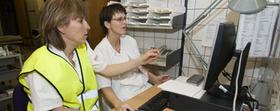Superbruger Charlotte Hansen hjælper afdelingssygeplejerske Krista Ølgod på ortopædkirurgisk ambulatorium med EPJ. (Foto: Region Midt)