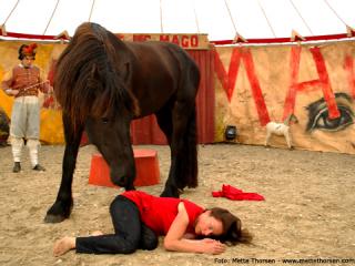 ”Levende dyr stiller ikke krav, men har behov, som man mÃ¥ tage højde og ansvar for. Her nytter det ikke at bide tænderne sammen og overse smÃ¥ skavanker, som man ofte kommer til som skuespiller”, forklarer Gitte Kielberg, og fortsætter: ”3 uger før premieren fandt vi ud af, at vores pony skulle skiftes ud, fordi den var blevet halt. Det er faktisk værre end at finde en ny skuespiller. Ponyen havde klaret sine opgaver til punkt og prikke, og det havde taget mÃ¥neder at opbygge den tillid og lydhørhed os imellem, der skulle til for at det fungerede. Hvad gør man sÃ¥? Heldigvis kom Katja Schumann os til undsætning. Hun havde en pony, som var vant til manegen og til nogle af de samme øvelser, som vi havde arbejdet pÃ¥. Den kunne vi da godt lÃ¥ne. Ponyen var en vidunderlig lille størrelse med en stor personlighed og charme. Han var bare en hingst. Og han var meeeget viril. Han endte med at bryde igennem indhegningen, hvor min store, flotte frieser vallak, der er forestillingens stjernespiller, gik sammen med en gammel hoppe. Det lille kræ bankede min hest. Det ville svare til at en 8 Ã¥rs dreng banker en sværvægts bokser. SÃ¥ vi mÃ¥tte aflevere ham igen og konstatere, at styrke og størrelse ikke altid har ret meget med hinanden at gøre. Heldigvis havde vores pony haft godt af den lille pause, og var pludselig ikke længere halt.”