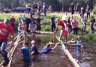 Eleverne var delt op i tre grupper, der alle skulle dyste i vandbold, sejlads med selvbygget tømmerflåde og konstruktion af en bro over skovsøen i plantagen. Det gik ikke stille af sig, og skiftetøjet slap hurtigt op.
