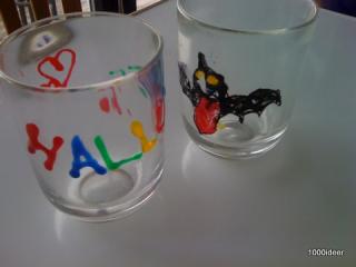 Glas med Halloween motiver malet med vinduesfarver.