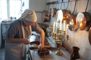 Kage rettes an i herregårdskøkkenet.