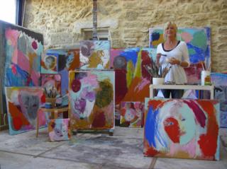 Annette Hoff-Jessen omgivet af nogle af sine billeder.