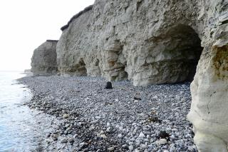 Flere steder er der huler i den lodrette Sangstrup Klint.