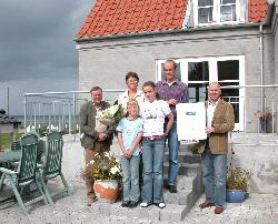 for nænsom restaurering og ombygning af det gammelt fiskerhus på Havet 18. Her ses de ved prisoverrækkelsen sammen med børnene Jesper og Rikke, og medlemmer af den lokale udvælgelseskomité redaktør Holger Frausing (yderst til venstre) og centerchef for Nykredit, Grenaa, Per Revsbeck (til højre)