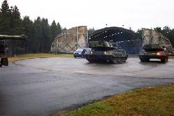 Militæret kører her tanks væk fra en af de ni shelters, som nu skal bruges til fyrværkerilager. Omkring 100 lastvognstog skal i den næste uges tid fragte et af Danmarks største fyrværkerilagre fra Gla