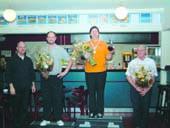 Her blev det uhyggeligt spændende, men efter de 3 serier lykkedes det Terry at hive mesterskabet hjem med blot 1 kegles forspring til nr. 2. En medvirkende årsag har jo nok også været de mange opmuntrende tilråb fra de klubkammerater, der var fulgt med til Struer. På billedet ses Terry Hawkins på toppen af sejrsskamlen.