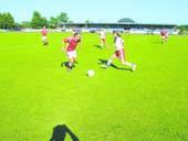 – Vi har en trup med mange spændende angribere, og derfor ville vi også prøve at stille op i en mere offensiv formation, end vi plejer, hvor vi kunne udnytte de offensive spillere. De unge fylder meget i truppen, og mange af de udtagne U/17-spillere spillede fremragende i Nordic Cup for U/17-landshold, siger landstræneren, der naturligvis kun kan være tilfreds med insatsen i de to kampe i Grenaa. Specielt den første kamp, hvor de danske piger sejrede med tennis-cifrene 6-1. 130 tilskuere på Grenaa Stadion så Danmark komme foran på et langskudsmål af kampens spiller Sine Hovesen fra Vejle Boldklub. Hun gentog bedriften blot 10 minutter senere med endnu et pragtmål - denne gang scoret med hovedet. Den hurtige føring udviklede sig desværre til lidt af en sovepude, der bød schweizerne tilbage i dansen med en 2-1-reducering kort før pausen som resultat. Danskerne kom dog stærkt ud fra pausen og viste flot spil, der resulterede i yderligere scoringer fra Sine Hovesen, Kicki Nielsen, Brøndby IF, Louise Kristiansen, Skovlunde IF, og Emma Madsen, Skovlunde IF. Isabelle Meyer scorede det enlige schweiziske mål.