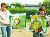 På billedet nederst ses hun sammen med kunstneren bag værket Steen Viberg Jensen (i midten) og kassereren i kolonihaveforeningen, Egon Pedersen. På billedet øverst ser man Pia Bertelsen og Trine Pedersen, der holder to af Steen Viberg Jensens malerier frem. Noget førstnævnte blev fristet til at købe af Steen Viberg i forbindelse med Søby-udflugten. Så han maler altså også billeder. Skal vi gætte på, at de nu har fundet deres plads på en væg i én af kolonihavehusene i »Oasen«.