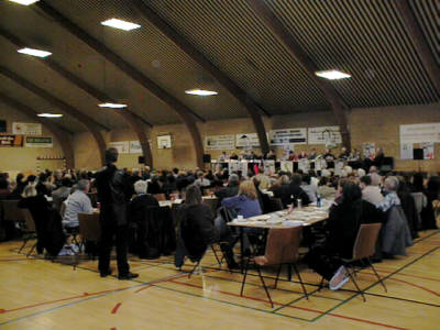 Nørre Djurs Hallen i Glesborg, hvor et stykke over 100 mennesker var mødt op. Vi skal