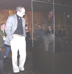 Ole Jørgensen er gået op til bilerne efter papirerne om udstillingen. Han er dansk og står for scenearrangementet. Imens går snakken. I den ene ende tales dansk. Her sidder Ingolf Steffensen, skulptør med egen stålfabrik i Ørum. Niels er gastronom på Mosebrugscentret og skal stå for maden til ferniseringen. Så er der Niels naturvejleder, Tom tømrer, Hans Jørgen chef og Laila Dalgaard, der er tekstforfatter. Hun skal digte om kunstnerne og deres kunst.