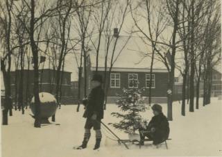 Hugo Svenstrup ved Vestre Skole - med Minebøssen, Teknisk Skole og biblioteket i baggrunden.