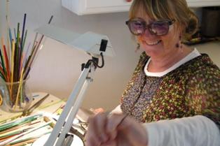 Karin Winther udstiller et udvalg af sine fine og finurlige glasperlesmykker, og i dagene 4. til 8. juni holder hun åbent værksted på biblioteket fra kl. 14 til 17. - Karin Winther er uddannet pædagog, og har altid beskæftiget sig med forskellige typer kunsthåndværk. - Men for snart fem år siden tabte hun sit hjerte til glasperlerne. Hun deltog i et weekendkursus hos Moeslund Glas i Ebeltoft, og så var hun solgt.