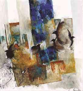 Malene Hammershøj har en forkærlighed for de blå og brune nuancer. Et silhuet af en fugl, et ansigt i profil eller måske en hest i fuld fart giver modspil til de abstrakte felter og sætter gang i fantasien.