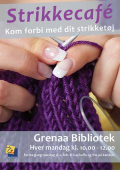 Fra mandag den 2. februar kl. 10- 12 vil der være strikkecafé på Grenaa Bibliotek hver mandag. Efter efterspørgsel har Grenaa Bibliotek sammen med frivillige kræfter valgt at oprette en ugentlig strikkecafé, hvor alle interesserede kan møde op med deres strikketøj. Ideen er at skabe et mødested for alle strikkeinteresserede, der har lyst til at mødes over en kop kaffe og sit strikketøj, eller andre nørklerier. Strikkecafeen er selvkørende og båret af frivillige kræfter, der vil være tilstede i strikkecafeen, når det er muligt. Eksisterende strikkeklubber og lignende er også velkommen til at møde op.
