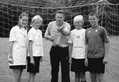 Den kendte håndboldtræner Morten Arvidson gæstede Håndboldskolen i Midtdjurs i sidste uge. På billedet ses fra venstre: Christina, Sara, Morten Arvidson, Mikkel og Mathias G.