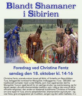 Foredrag ved Christine Fentz. Christine er scenekunstner og bosat på Mols. Hun vil fortælle om Republikken Tuva, beliggende nordvest for Mongoliet. Indbyggerne i Tuva - ca 300.000 - var traditionelt nomader med runde filttelte, som man også kender det fra Mongoliet. Tuva er også kendt for sin særlige strube- og overtonesang, og for deres næsten ubrudte shamanistiske tradition, som i dag er den ene af de to officielle religioner; den anden er tibetansk buddhisme.