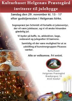 Kulturhuset Helgenæs Præstegård inviterer til julehygge. Efter gudstjenesten i Helgenæs Kirke vil sognepræst Jan Schmidt fortælle et juleeventyr. Der vil være julebazar og man vil ønske hinanden glædelig jul. Der bydes på kaffe, te, æbleskiver, kage, sodavand og julegodter til børnene. Samtidigt vil det være muligt at se udstilling af kunstnergruppen Picassos værker. Alle er velkomne og der er fri entré.