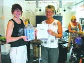 På billedet overrækker indehaveren af »Klippehjørnet« Jytte Syppli Johanson (t.v.) præmien i form af 1 års forbrug af Schwarzkopf Bonacure-shampoo til konkurrence-vinderen, Randi Andersen, Grenaa.