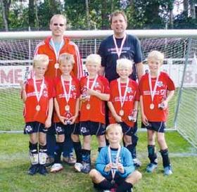 På billedet er det fra venstre de nye Jysk/Fynske Mestre: Mads Dalgaard Nielsen, Gustav Thomsen, Lauritz Rasmussen, Christian Petersen, Christian Bech, knælende målmand Jacob Christensen. Bagved drengene står trænerne Jens Chr. Rasmussen og Søren Bech.