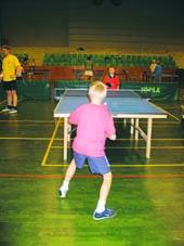 Efter aftensmaden gik turen til Idrætscentret, hvor »bordteamet« i løbet af dagen havde stillet de 40 borde, bander og dommerborde op, så der var klar til bordtennis for to-mandshold.